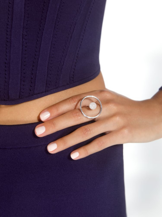 Sterling Silver Orbit Ring with Pearl, Adjustable and Rhodium Plated